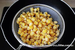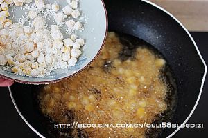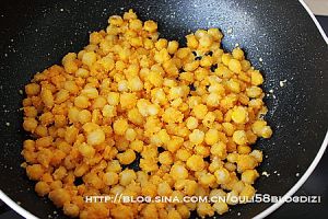 将玉米粒下锅煸炒,使每粒玉米都均匀裹上咸蛋黄