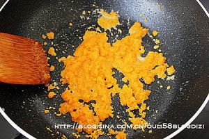 锅里放一勺油,将咸蛋黄末放入锅中小火煸炒,等到蛋黄开始冒泡沫时,