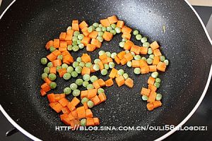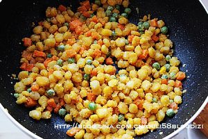 玉米粒洗净控一下水分,胡萝卜切小丁,豌豆剥粒