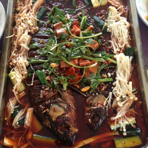 集烧烤、水煮、响油三种烹饪方法的葱油烤鱼,劲爆上桌了。麻辣鲜香,色泽红亮,鱼肉入味,汤汁鲜美。将烤盘架在桌上,烤盘底下用固体酒精炉燃烧,更使沸腾的汤汁渗入到鱼肉,香气四溢,诱惑难当。