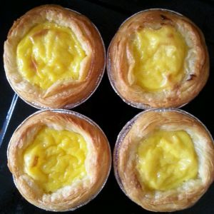 将塔皮摆在烤盘内。倒入蛋挞水,8分满即可。 我指定是倒少了。装入烤盘,放入约热好的烤箱中层。210度,25分钟左右,烤至蛋挞表面出现焦点即可。