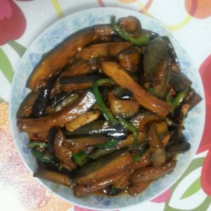 要不停翻炒,炒至茄子变软,(记住千万不要加水!)加入青椒翻炒均匀,盛盘即可