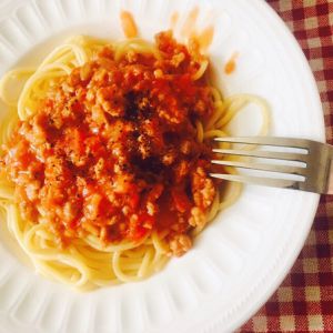 锅中放入黄油、烧热后加入肉馅炒熟,加入切碎的西红柿和番茄酱煸炒出汤!加入三勺奶油盖盖煮两分钟!后尝尝咸淡去加盐!