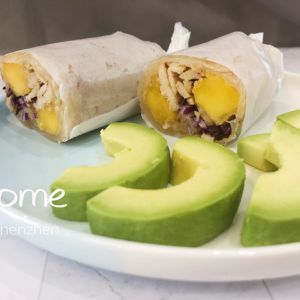 紫甘蓝切成丝,鸡胸肉锅内煎香,芒果切成条状