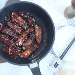 5、国内放少许有,将排骨中火煎成两面金黄色。