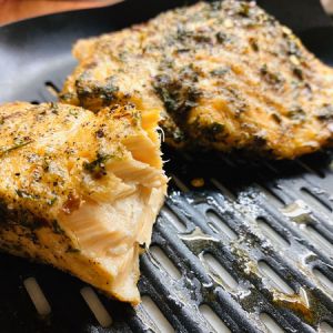 把所有调料均匀得裹住三文鱼,稍加按摩,入空气炸锅烤8分钟。