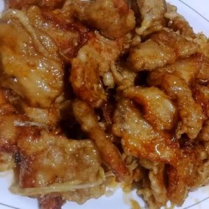油温180℃下肉片,必须保证高油温,每片肉下进去都要是个平整的片,折叠或一团影响口感,第一次炸至定型,不用全熟,能听到笊篱碰到肉片时有特别脆的碰撞声,马上捞出平摊