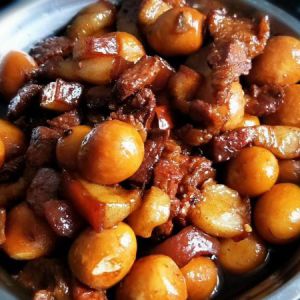 高压锅压过的肉,油煸出来后就变得肥而不腻,比之前切的时候小很多,放鹌鹑蛋下去继续炒,因为之前酱油放了半碗,肉偏咸了,所以放鹌鹑蛋之后就可以不用再放盐了。炒至鹌鹑蛋熟,出锅装盘。