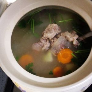 文火慢炖十五分钟。喜欢浓稠口感的这时可以盛出一些汤汁,加入适量淀粉勾芡后倒入砂锅。