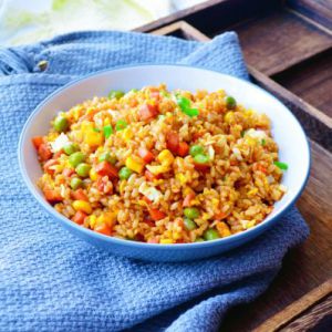 锅中再加一点点油,倒入火腿丁炒出香味,再倒入蔬菜丁翻炒均匀,加入米饭炒散。