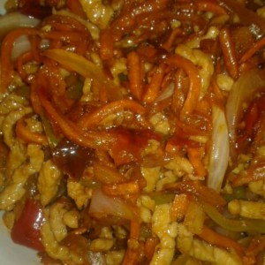 肉下油锅炒熟。捞出留底油,放入豆瓣酱,炒出红油放胡萝卜,洋葱,尖椒,然后放白糖,醋。菜差不多快熟的时候放肉丝。翻炒几下,出锅。