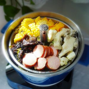 我用的配菜有生菜,香菜,葱,火腿,红薯,玉米和木耳,其中玉米是熟的,所以不用煮很久,加热即可,红薯切块。