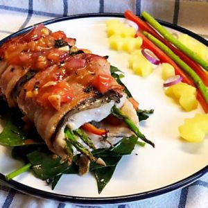 将芦笋和彩椒放在鱼上,另一半鱼盖在上面
