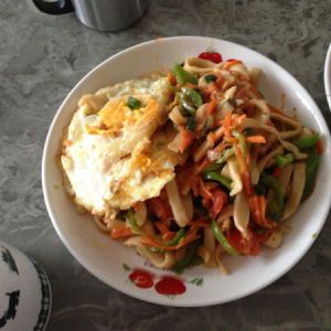 先炒丝,盛出,后煎蛋,盛出。炒蕃茄面条,放入调料,然后把丝一起放锅内略炒即可,如果太干可以少加点水