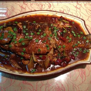 再起锅放入少许油,放入姜、葱段,干红椒炒、盐、鸡精,把炸好的鱼放进锅里,放入少许的老抽和料酒,再加水煮(水不宜太少,漫过鱼肚即可);