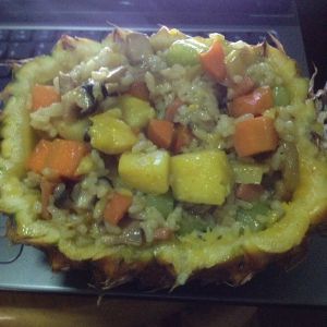 菠萝用盐水泡十分钟切丁 旁边是洋葱