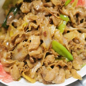 倒入羊肉卷翻炒几下,加入两汤勺生抽,一汤勺孜然烧烤料,翻炒均匀。成盘开吃。