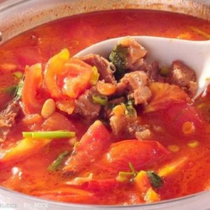 锅中热油,放两汤勺番茄汁,加入两勺糖两勺盐一勺鸡汁,慢慢搅拌至浓汤变红。以水:番茄汁2:1的比例加入水,倒入牛腩,切好的番茄块,炖5分钟即可