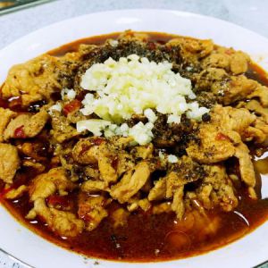 最后一步增香的灵魂就是按照自己口味撒上辣椒面、花椒面、蒜末,一大勺热油浇上去,搞定!