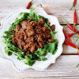炒的时候会出很多水,加入佐料辣椒,白芝麻,孜然,茴香翻炒,我用的是比较粗的辣椒粉,这个口感不辣,喜欢吃辣的换成细的辣椒粉,最好粗细掺在一起放,只放细的太辣了