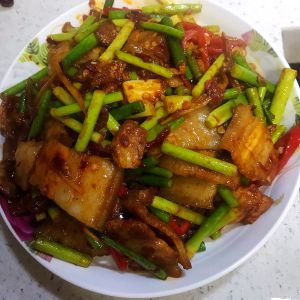 五花肉煮好之后出锅切片备用,另外准备图中调料一会炒菜用。