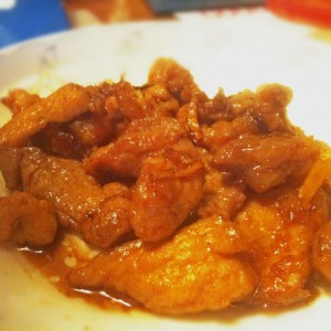锅内剩一点油,下葱姜丝炒出香味,倒入事先混好的调味料烧开,再倒入炸好的猪肉,翻炒上色。可以加入少量老抽调色。