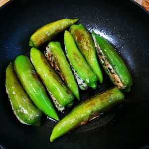 挑选大小适中,比较直的青辣椒,洗干净后从侧面剖开,把辣椒籽去掉