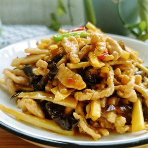 倒入肉丝,倒入调味汁,大火快速翻炒2分钟。
