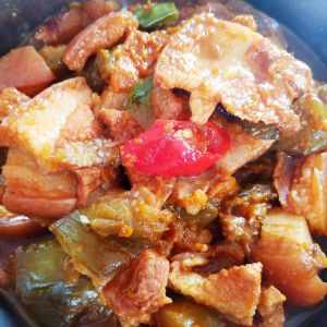 等汤汁不多时,放入茄子南瓜辣椒继续小火炖煮15分钟左右即可,(看个人口味,时间可长可短,熟了就可以,我喜欢软烂一点的,炖了比较久)美味的猪肉南瓜烧茄子就完成了!