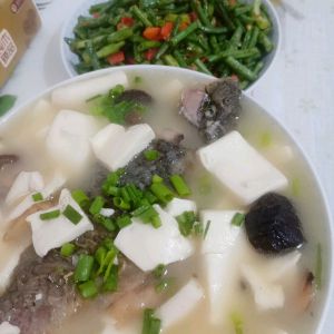 将豆腐放进去加入适量盐和鸡精 改中火煮二十分钟以上(时间越长汤汁越白越浓)