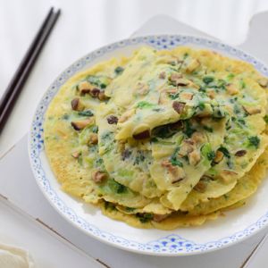 舀一勺面糊,摊平,或转动锅子让面糊摊圆,表面煎至凝固,翻面再煎另一面