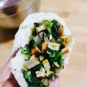 锅里放油,放入香菇翻炒,再倒入豆腐干翻炒,炒至香菇变软,倒入青菜里,加入调料拌匀