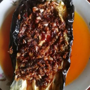 一根长茄子,洗干净,放入微波炉里或是,炭火上烤十分钟,烤透烤熟