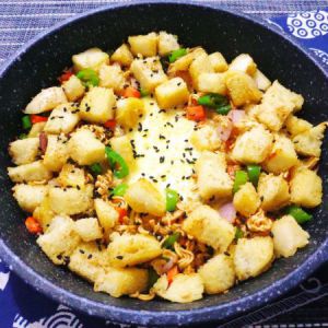 下入馒头小方块翻炒一会儿