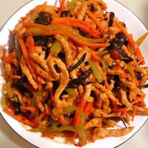 加入木耳后翻炒两三分钟,下入青椒和胡萝卜