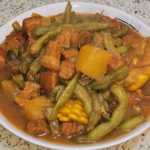 依次放入豆角,玉米,水量以刚好没过食材为准,大火烧开改小火盖盖炖20分钟