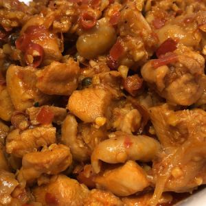 加盐、糖调味。盐不要太淡不让吃着没味,糖用来提鲜中和辣味,不要太多。收汁到1/3时加入蒜瓣翻炒汤汁收干,配料可以包裹在鸡肉上时就可以出锅了。