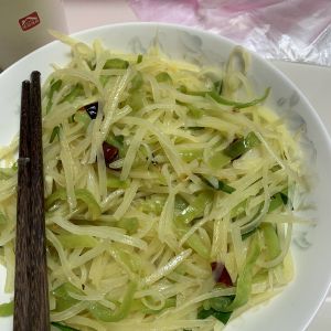 干锅下油,下花椒炸出香味取出来,下干辣椒和蒜片,出香味下葱白、青椒丝,放土豆丝,加盐,锅底稍微有点干的时候放米醋,,快炒均匀之后放葱段,起锅