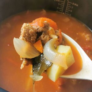 倒入电饭锅,加土豆、胡萝卜,放入2片香叶,冷水没过食材,电饭锅煮饭模式40~60分钟