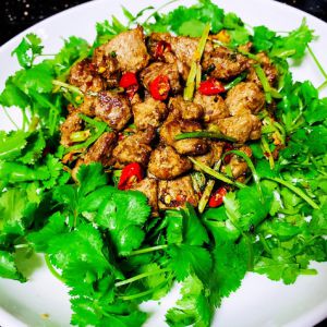 把香菜叶子垫在盘子上面,再倒上刚刚炒好的羊肉即可,香喷喷的孜然羊肉就做好了!
