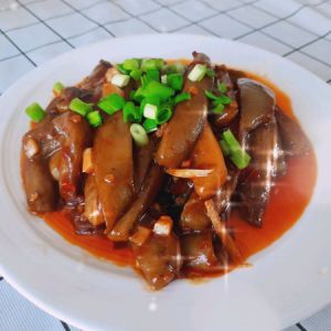 收汁,盛入盘中,撒上香葱。