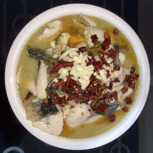 先放鱼头和鱼骨,煮熟后盛出。用剩下的汤煮鱼片。最后放上干辣椒、花椒、蒜末,淋一勺热油。