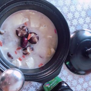 煎好的鱼放进砂锅,然后把香菇,红枣放入!加开水,大火烧开转小火慢炖!再与大约十分钟后放入豆腐,继续慢炖!至半个小时后,汤汁奶白浓稠即可,放入适量盐和白胡椒粉,洒点枸杞点缀就关火出锅了!