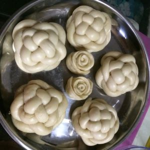 静发后再揉面团2~3分钟,将气排出来,然后将面团分至20~25g的分就后,至于要怎么编的话其他菜谱已经说得很清楚了,我就不再重复了(写菜谱主要是想记录自己做过的菜,别回头忘了罢了=_=)
