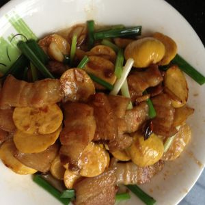 水分熬干,糖少许盐少许料酒少许酱油少许加入小葱翻炒一下出锅,美味可口的红烧肉成功哩!