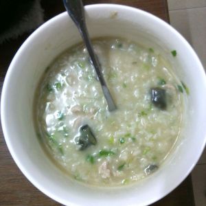 把昨晚切好的瘦肉,皮蛋,生姜放进大米里,加开水,开水是因为现在的自来水都有消毒粉味道,煮开散掉味道比较安全,而且粥也快熟,按煮饭健就行