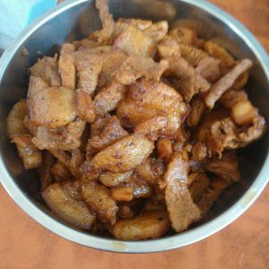 2、在锅中放少许油,待油温热,将蒜片,八角放到锅中煸香,加入肥肉继续炒,再加入瘦肉一起炒,加一点白糖,在倒一些厨邦酱油炒一下,迅速倒入料酒,避免干锅,待酒完全被肉吸收,再加水,盖上锅盖闷一会儿。