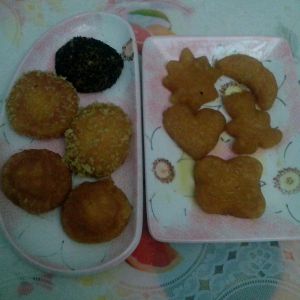 手搓成条状,分成小等份。手搓成圆形,稍压扁。我做了裹黑芝麻的,面包糠的,还用模具做了其他的形状。