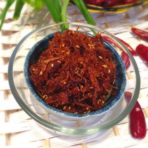 炒锅入适量食用油,加入细辣椒粉炒出颜色后加入芝麻炒香。后加入牛肉丝,生抽,盐,味精,糖,十三香,白酒煸炒至肉质变干即可。