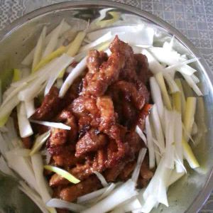 将葱切丝,放入盘中,大功告成!不爱吃葱的朋友加黄瓜丝也可以
